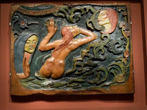 I also think it’s interesting that this piece and the one below both feature figures similar to many of his south seas paintings, but in the carving, below, he has added color.