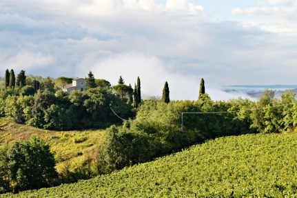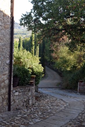 Directions to Borgo Argenina instruct travelers to turn off the paved road onto the gravel one. Calling this gravel stretch a road requires a leap of faith. It’s a single lane, rutted and rocky, that passes first through some trees and brush and then vineyards. Eventually, the road dips down, then climbs up to the cluster of stone buildings that is Borgo Argenina.
