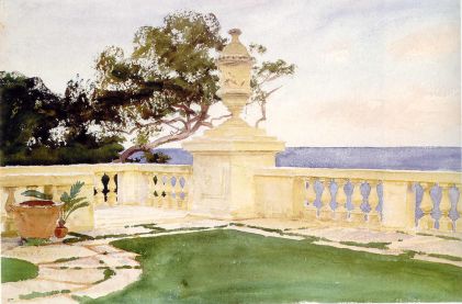 Sargent painted a series of watercolors much later while staying at the Florida estate, Vizcaya, of his friend and benefactor James Deering. One from the AI exhibition is The Terrace at Vizcaya, 1917. Here the color is much lighter, more “Florida.”
