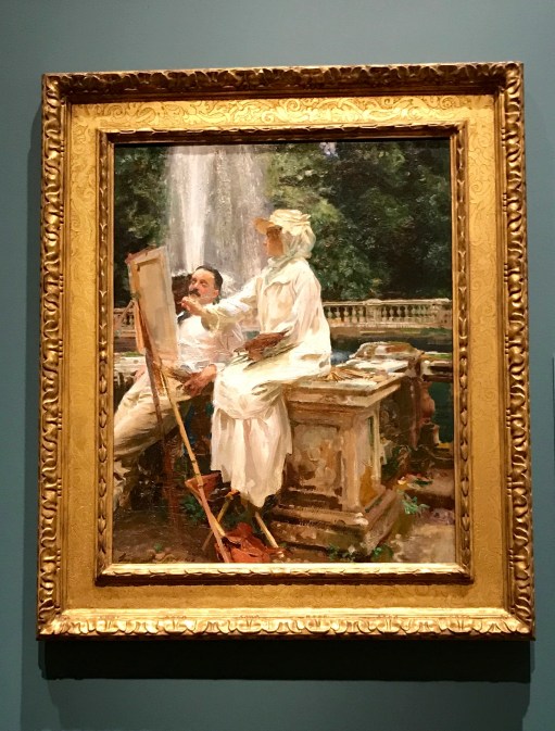 One of my favorites from the AI exhibition, The Fountain, Villa Tortonia, Frascati, Italy, 1907, captures Sargent’s transition from portraitist to plein air painter. The couple are Wilfred and Jane Emmet de Glenn, professional artists and friends of Sargent.