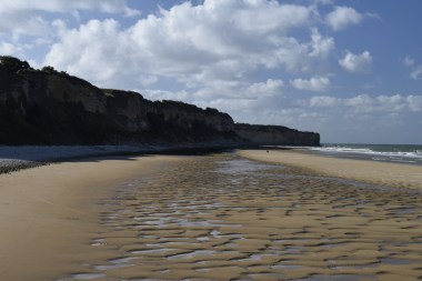 Pointe du Hoc was the highest point along the coast between the Omaha and Utah landing beaches. In 1943 Germans troops built an extensive battery here using six French WWI artillery guns and early in 1944 began adding to the battery. D-Day plans included an assault by specially trained Army Rangers to breach the steep cliffs and disable the guns. The cliffs are formidable here and the ground atop them is pock-marked by bombings and gun placements. It’s rough to walk today, particularly in a sharp wind, and impossible to imagine how challenging it was on D-Day.