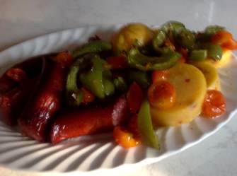 If you have not heard of sheet pain suppers, where everything is essentially roasted together on a standard sheet pan, you’re missing out on some delicious, easy cooking and clean up. Although a lot of these recipes are geared to larger families, I have easily modified them for the two of us. And it’s also easy to tweak the main ingredients to your preferences. My latest effort starred smoked sausage (my husband’s request) which I paired with halved cherry tomatoes, sliced peppers and slices of polenta. Despite the fact that the cherry tomatoes pretty much cooked down to nothing (I think I might try halved or quartered romas next time), we really enjoyed this. We had never tried polenta this way, but it roasted beautifully. The peppers were delicious, and I would add more next time.