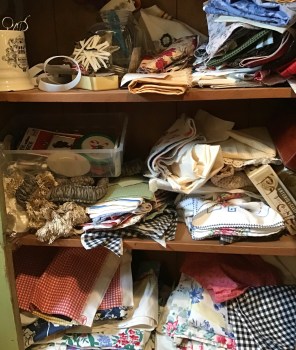 Long before I fell in love with cooking, I found sewing and other needlework to be equally engaging. When I started shopping vintage and antique markets, I was quickly drawn to the vintage tablecloths and fabrics available. (And by this I mean I seem to have an inner sensor that detects barkcloth draperies, 40’s tablecloths, antique French grainsacks and linen towels before I even see them!) This explains the bundles of vintage and new fabrics I have stuffed in a cabinet downstairs. So, I opened the cabinet doors where I keep this stash, and I’ve been measuring, cutting, sewing and letting the creative juices flow. I have no finished projects (except for a few homemade face masks), but I’m having a terrific time. And I will share what I eventually have to show for this effort!