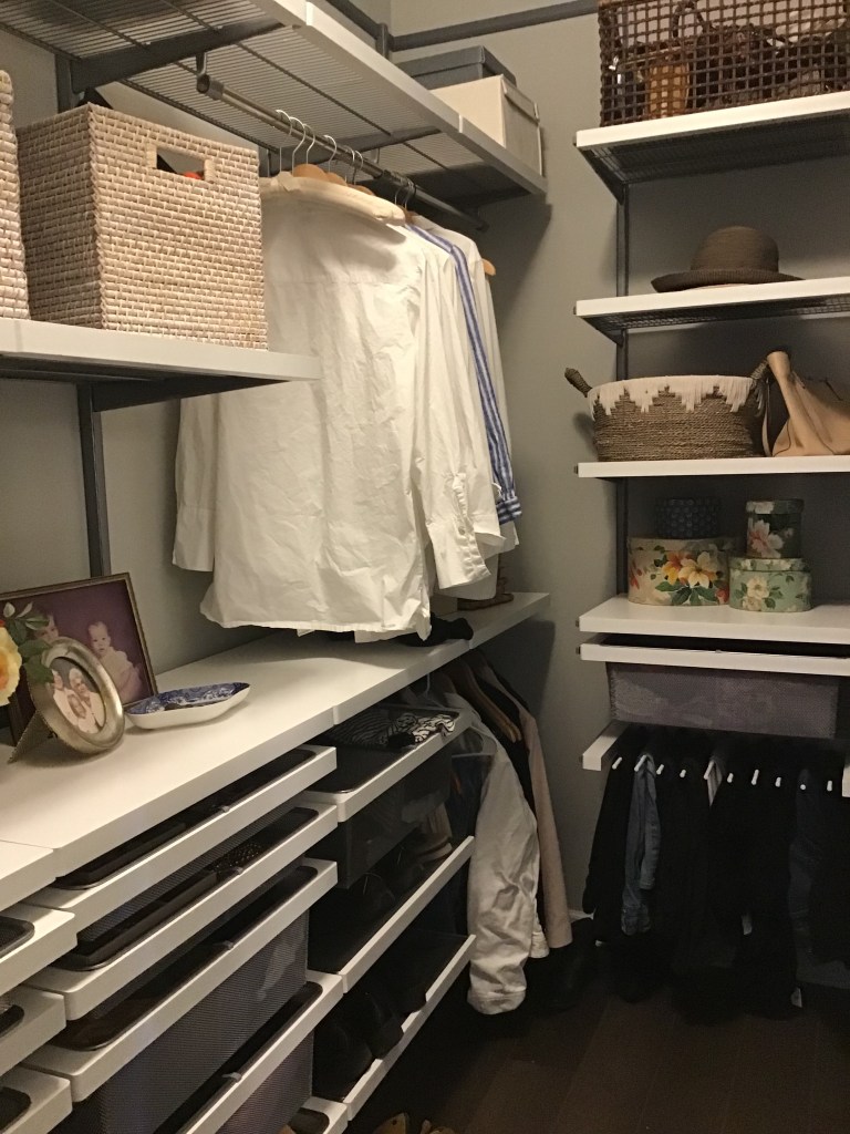 So, we measured the space and talked to the closet designers at The Container Store, and in fact went back and forth with them a few times tweaking the plan. They were terrific.. We eventually landed on a really workable design, but then kind of sat on the plan. We were caught up in other, more pressing projects, and, frankly, even with the coupon it was still pricey. Then came an even better sale. So, yes, we did it, installing it ourselves. Here’s a quick look at how that turned out. We love it! Our clothes are neatly stored, the floor is clear (my goal!) and we have storage space to to spare! I’ll share more details on this in a later post too, since we learned a few important points in doing this.