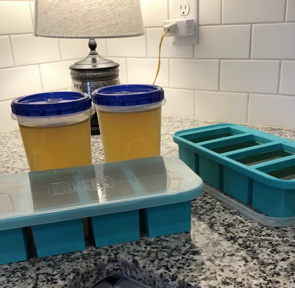 This is so easy. It takes me about 10 minutes to assemble and after two hours of simmering another 20 minutes to strain and package for freezing. I feel totally virtuous when I have all this broth tucked away in the freezer. My daughter-in-law capitalized on that when she bought me these silicone “soup cubes.” Each cube holds a cup of stock, perfect for portioning smaller amounts for recipes. I freeze the stock in the silicone cubes, then pop the frozen stock cubes into a plastic bag to keep in the freezer.