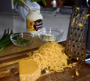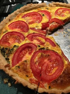 After rolling the dough out on a floured surface and transferring to a parchment-lined sheet pan (per Ina’s instructions), I realized it would have been easier to roll it out on the parchment, then transfer the paper and dough to the pan. Next time. After baking the crust, it’s layered with a coat of dijon mustard, then grated gruyere cheese, then the sliced tomatoes tossed with the herb seasoning, more gruyere and a final dusting of parmesan. This all goes back into the oven to roast the tomatoes and melt the cheese. After cooling a bit, I cut it into squares and we ate it warm, though you could also serve it at room temperature. This was good, but very cheesy. As much as I like gruyere, I would use less next time.