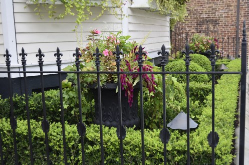A lot of Charleston houses are stucco . I especially like the black iron and trim. I know, here I go with fences again, but look at how the vines have woven themselves into this wrought iron. Finally, I love this window box. Nothing fancy, but so lush!