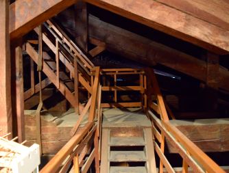 My husband and I loved the idea of these hidden doors. If you have read Dan Brown’s Inferno, or seen the Tom Hanks movie, you undoubtedly recall the crazy chase thru the Palazzo Vecchio. Remember the scene above the ceiling of the Hall of 500? After climbing dozens of narrow stairs, we were up in a corner of it. The space was more cramped than it appeared in the movie, but still very cool to see how the Renaissance building was assembled. Alternating rafters support the roof above and/or hold the ceiling below. What genius Renaissance architects displayed!